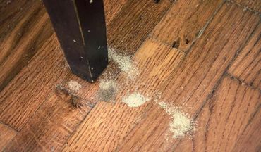 The larvae of **powderpost beetles** produce fine, powdery dust by feeding on wood.